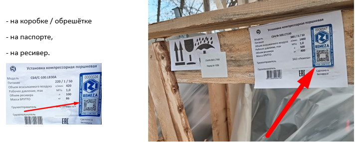 Начиная с марта 2024 года все поршневые компрессоры Ремеза в обязательном порядке имеют маркировку с НЕ копируемым QR-кодом в трёх местах: